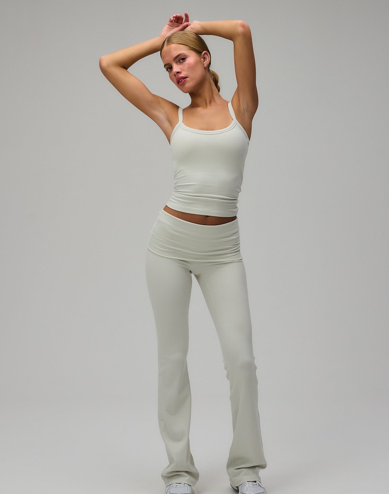 - Model har Rib Fold Over Pants, Long Version på og bruger størrelse XS