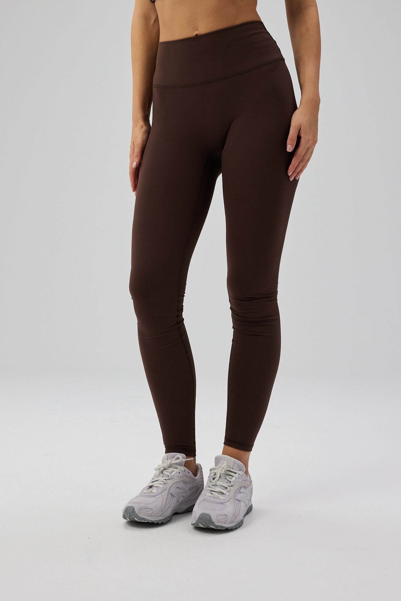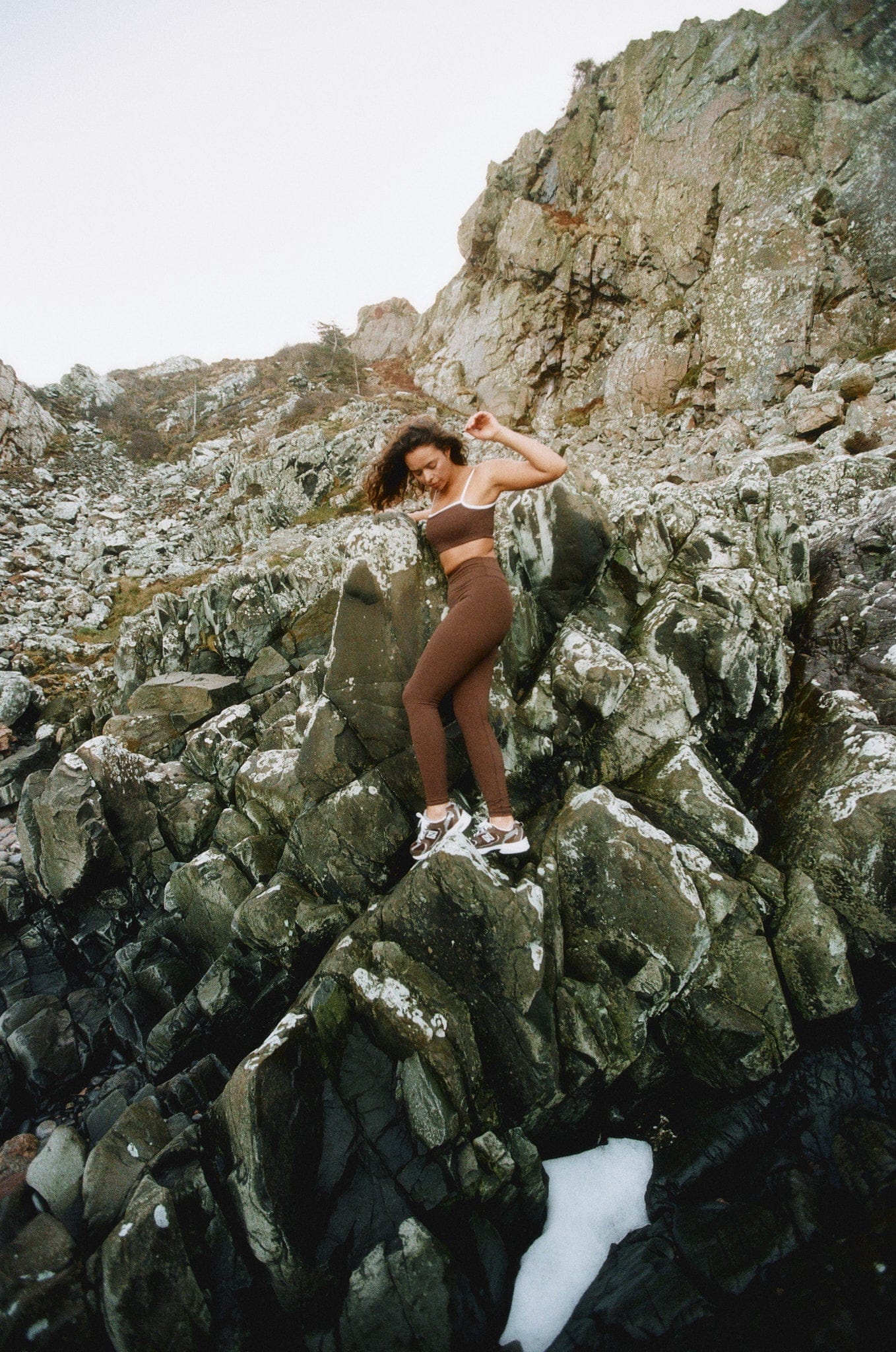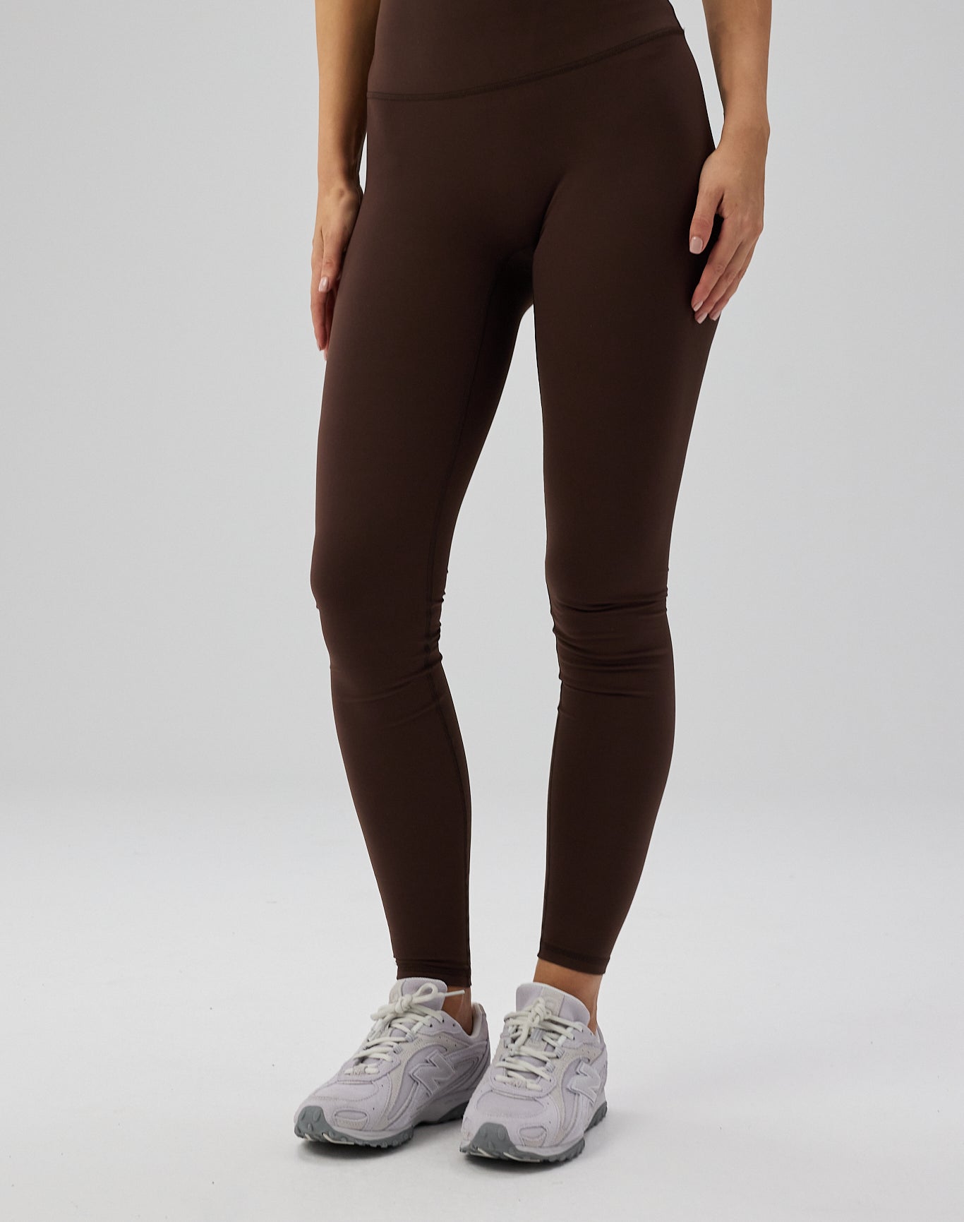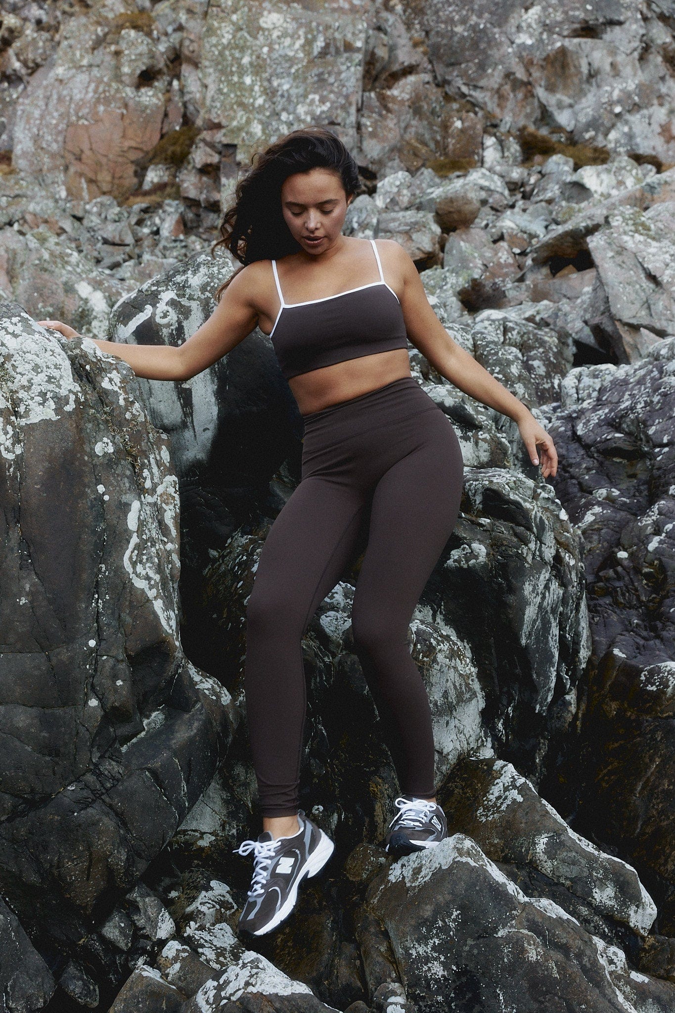 - Model har Sculpt Scrunch Tights, Pecan Brown på, og bruger størrelse XS