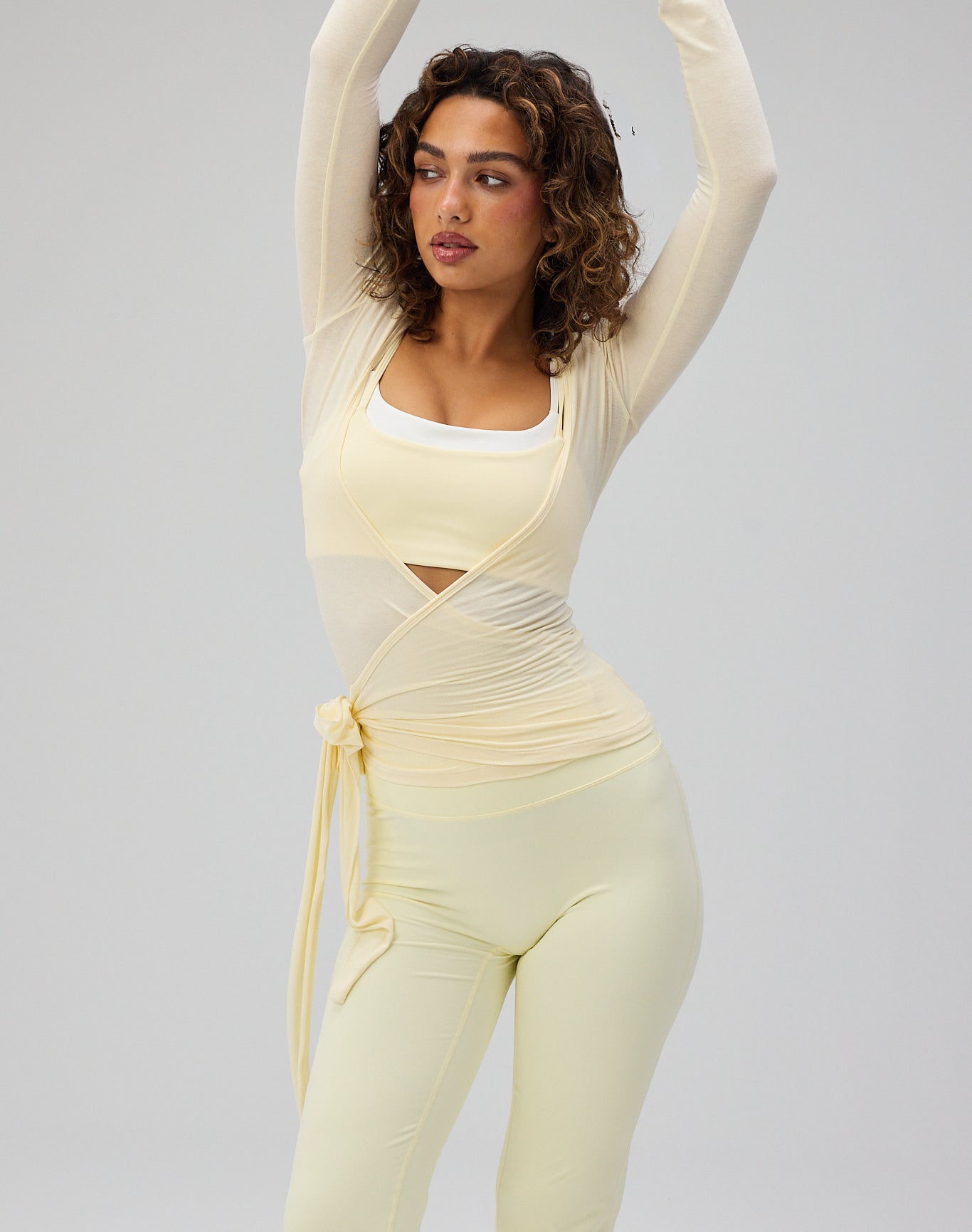 Ballet Wrap Blouse forener elegance og komfort i et let og feminint design. Den langærmede silhuet er skabt i et blødt og strækbart materiale, der føles behageligt mod huden og bevæger sig naturligt med kroppen. De tætsiddende ærmer og de justerbare bindebånd giver mulighed for at forme pasformen og fremhæve taljen på en blød og harmonisk måde. Wrap-detaljen tilfører et elegant præg og understreger blusens lette og balancerede silhuet.