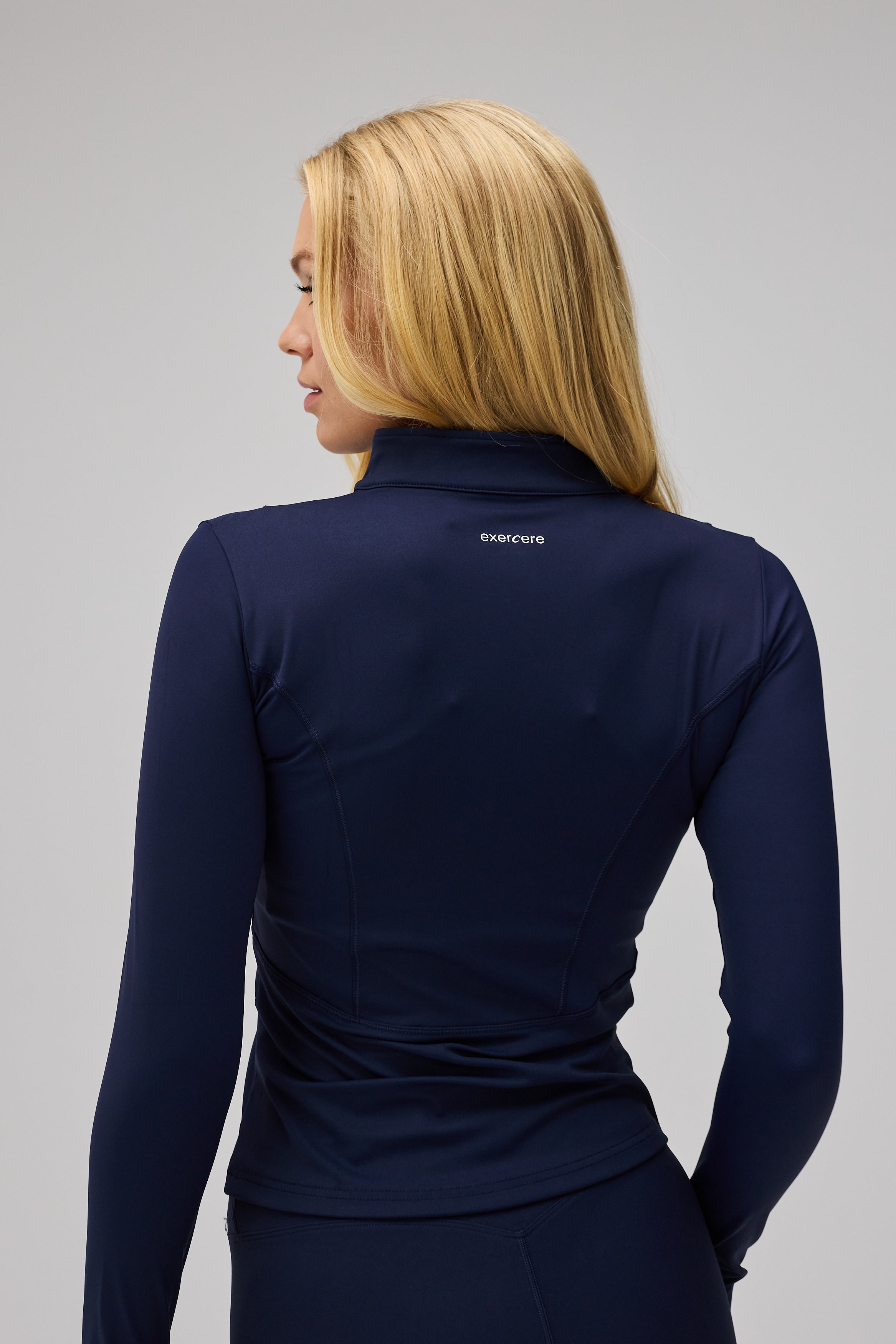 - Model har Hyper Zip Blouse, Navy på og bruger størrelse S/M