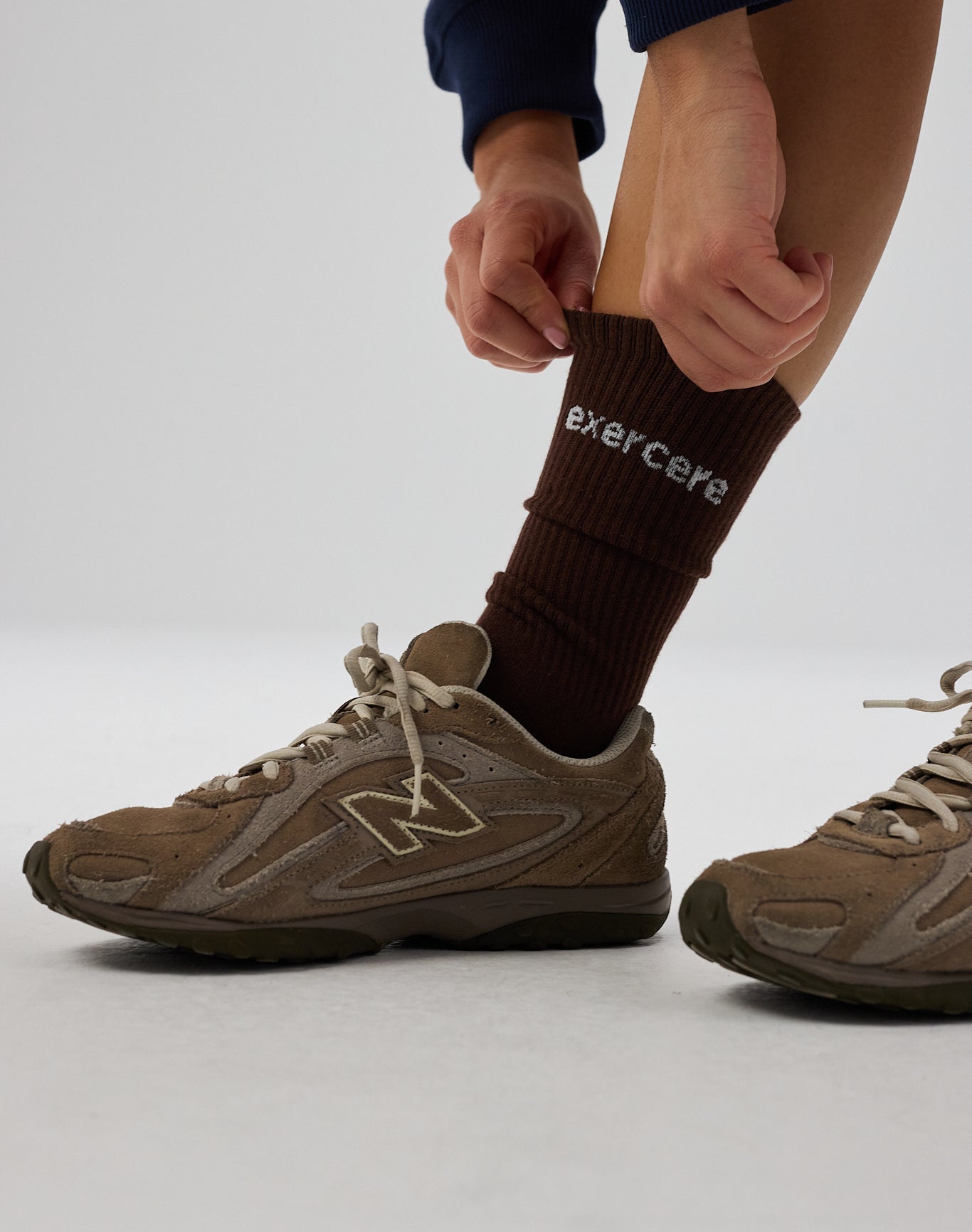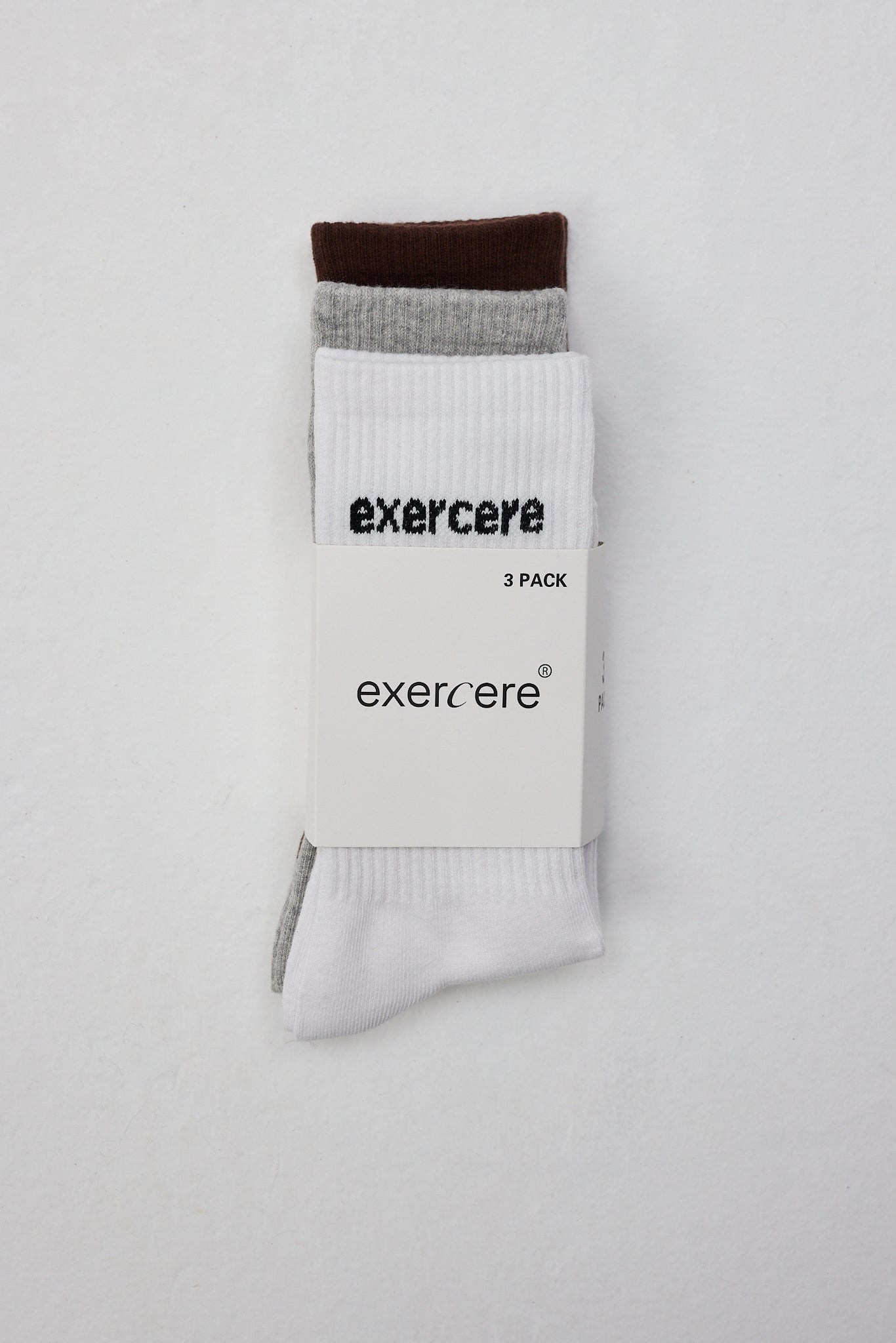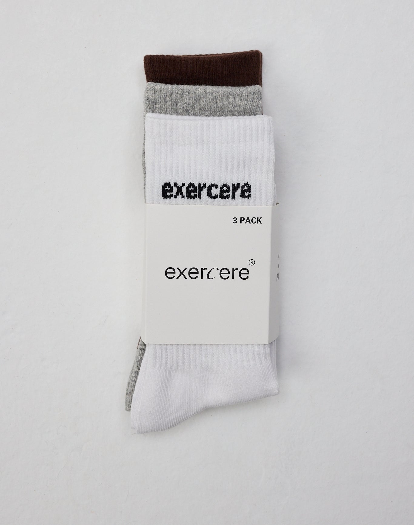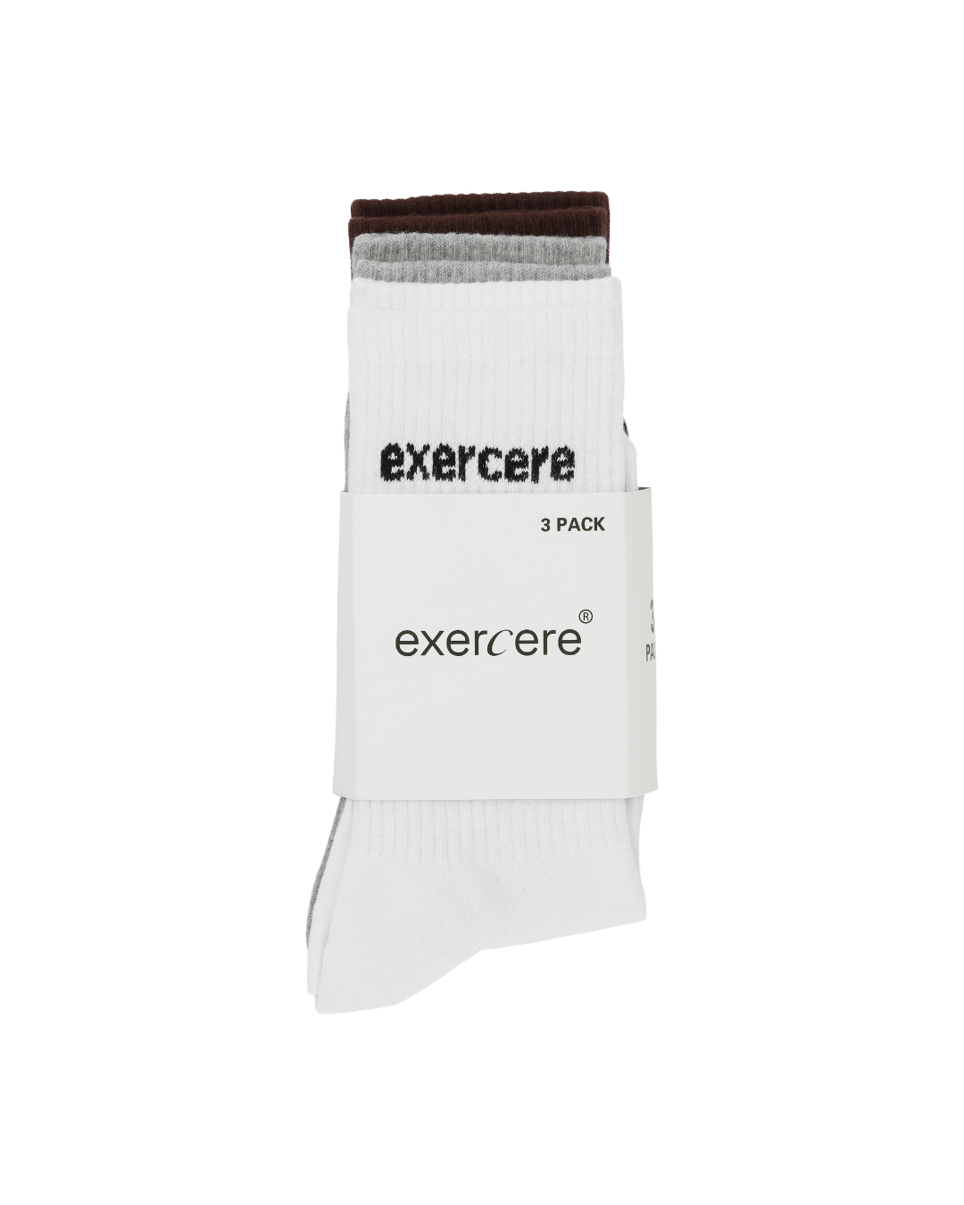 Exercere-logoet er diskret placeret på siden og tilfører et enkelt, genkendeligt element til det rene design. Den ribstrikkede struktur bidrager med elasticitet og et tidløst, sporty præg, der gør sokkerne velegnede til både træning og hverdagsbrug.