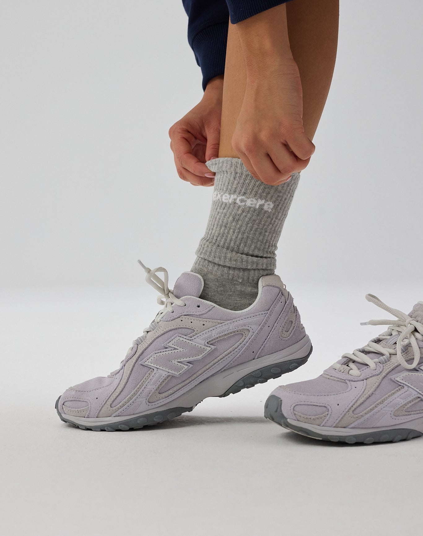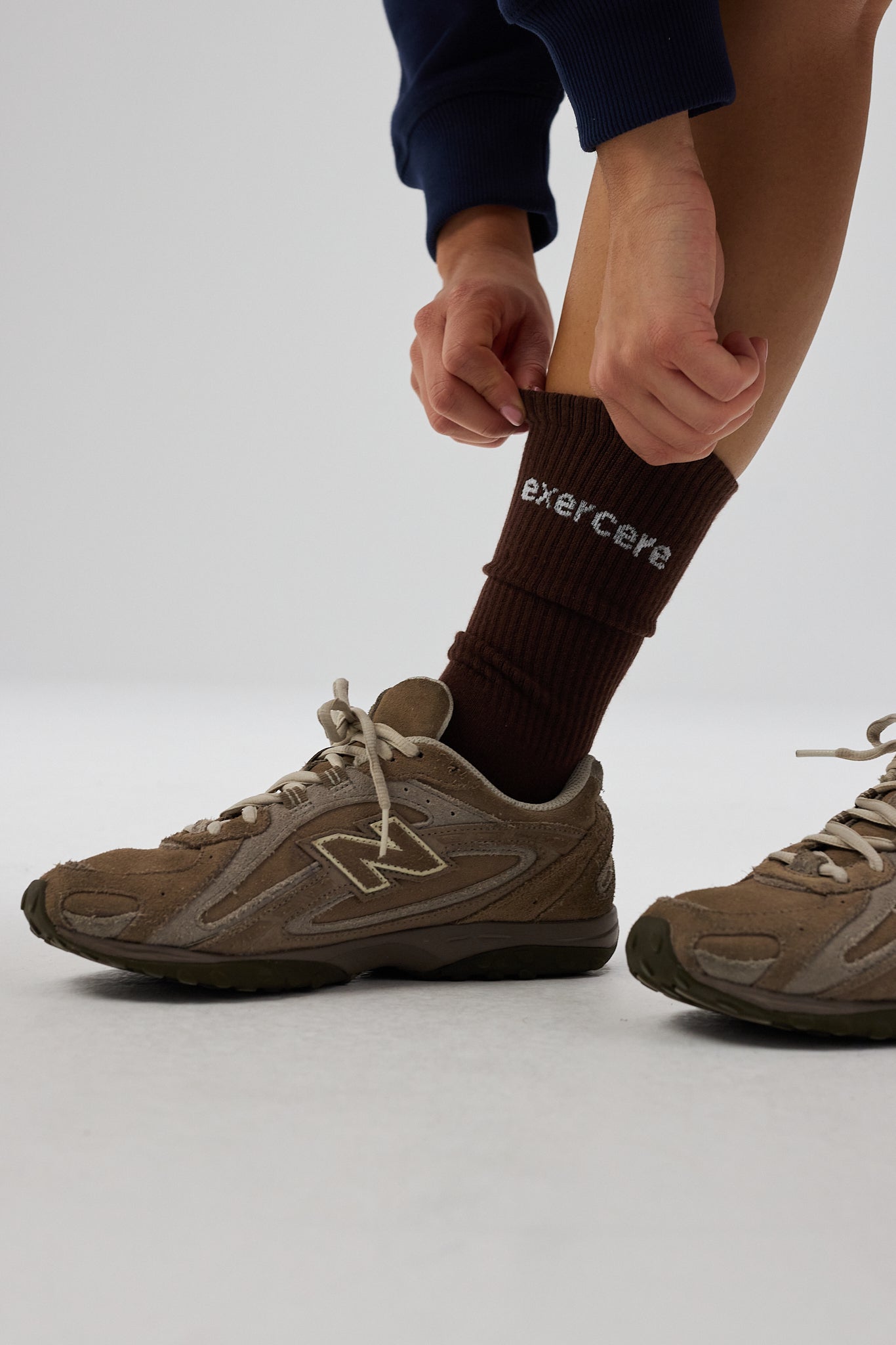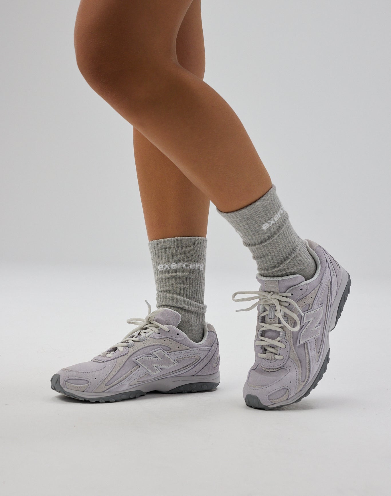 Exercere-logoet er diskret placeret på siden og tilfører et enkelt, genkendeligt element til det rene design. Den ribstrikkede struktur bidrager med elasticitet og et tidløst, sporty præg, der gør sokkerne velegnede til både træning og hverdagsbrug.