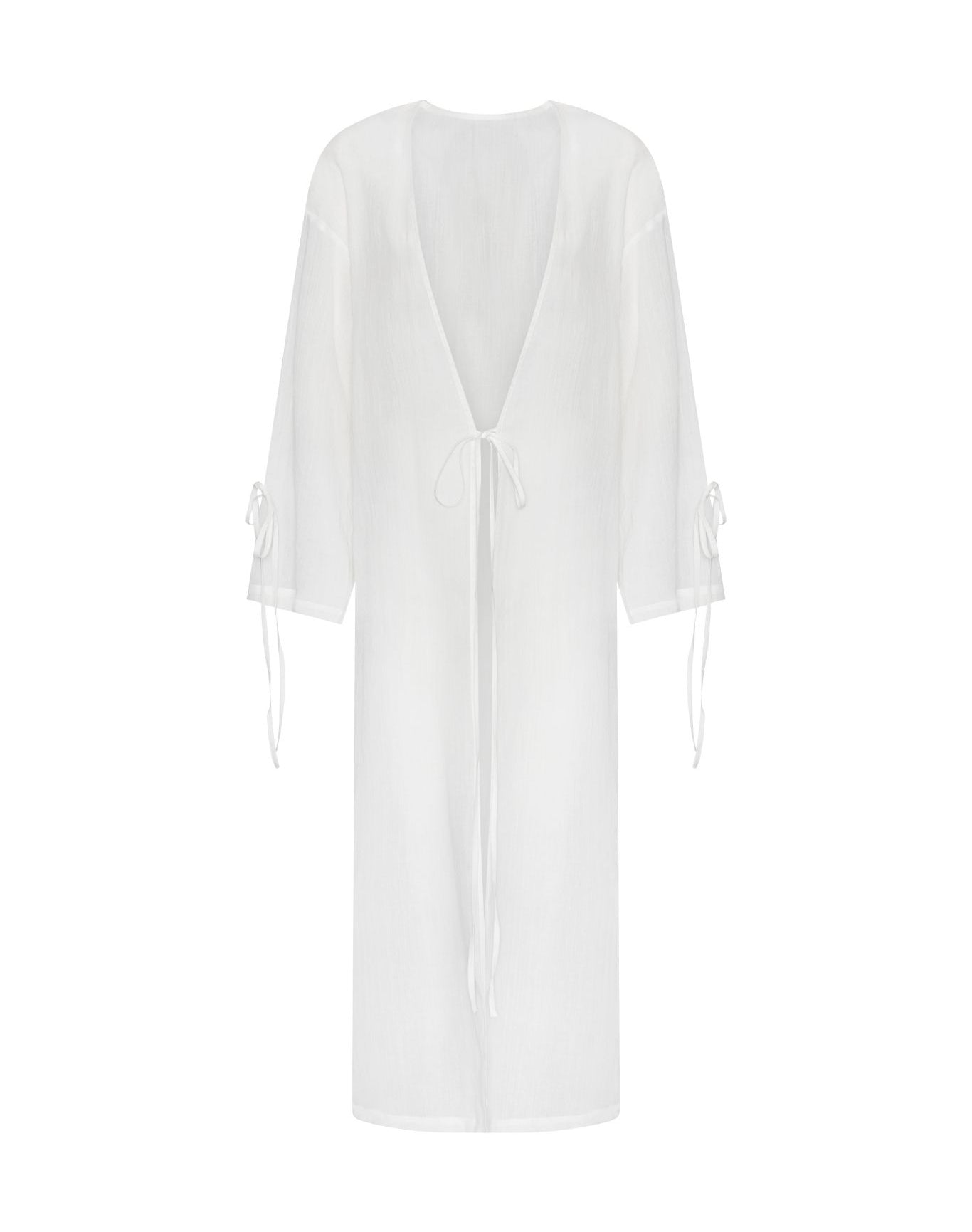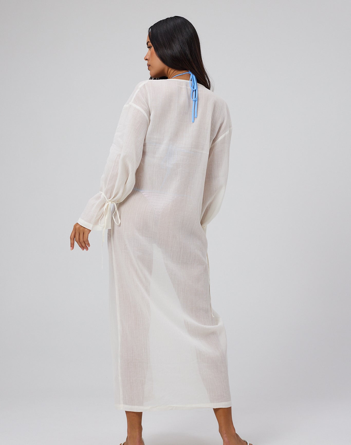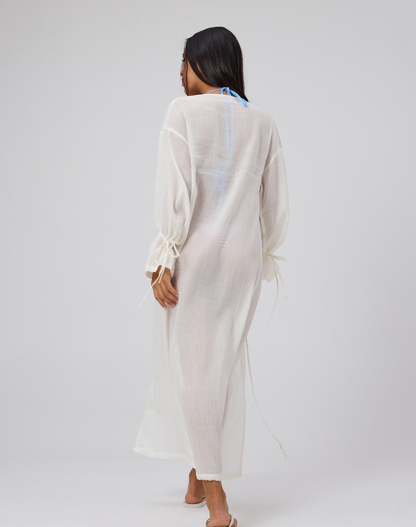 Kimonoen kan bindes i taljen, hvilket giver mulighed for at tilpasse pasformen og skabe variation i udtrykket. De fine ærmedetaljer tilfører et blødt og gennemtænkt præg, der understøtter det lette og feminine design. Breeze Kimono er et stilrent sommerlag, der falder ubesværet over kroppen og fuldender et let og elegant udtryk - ideel over en bikini på solrige dage.