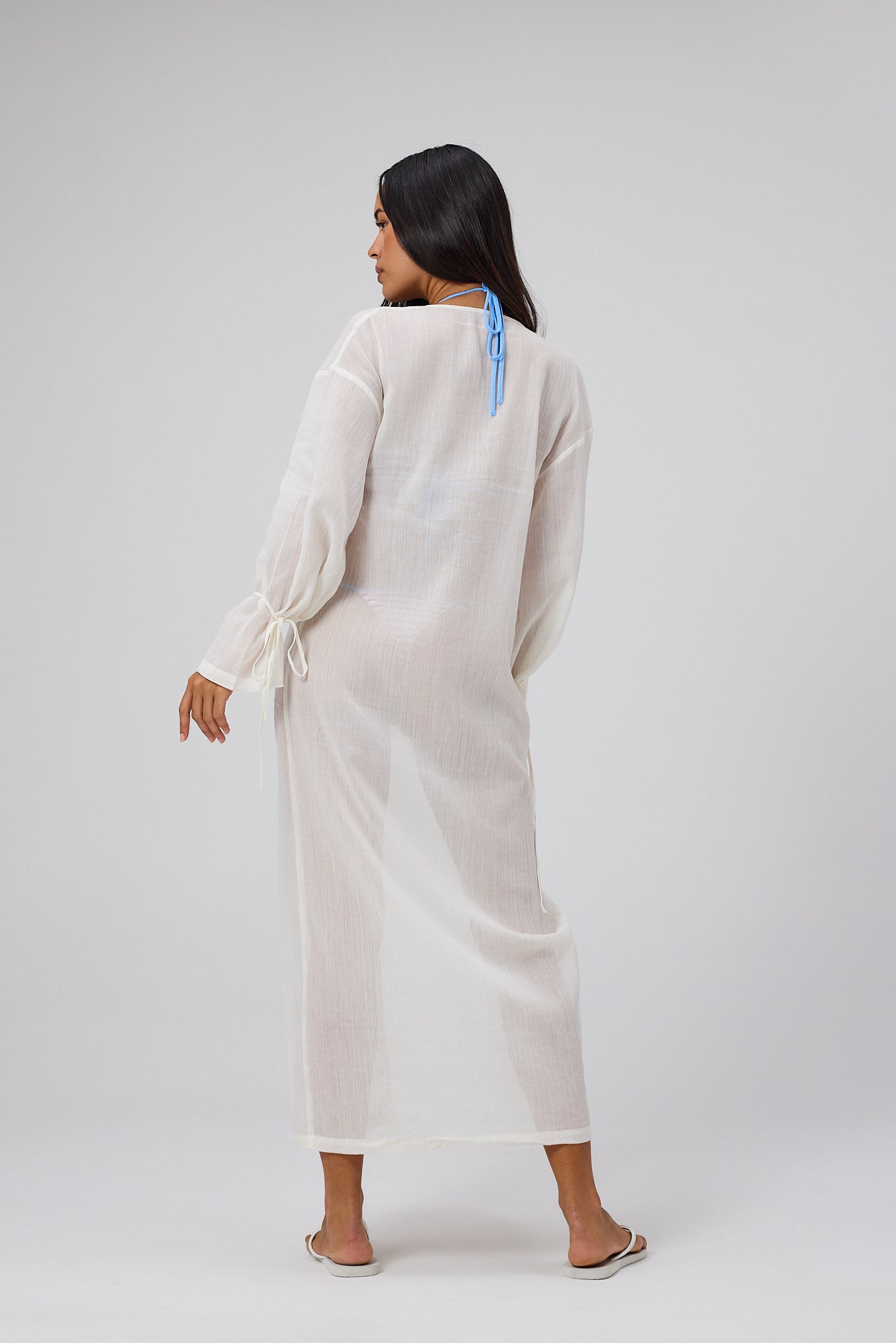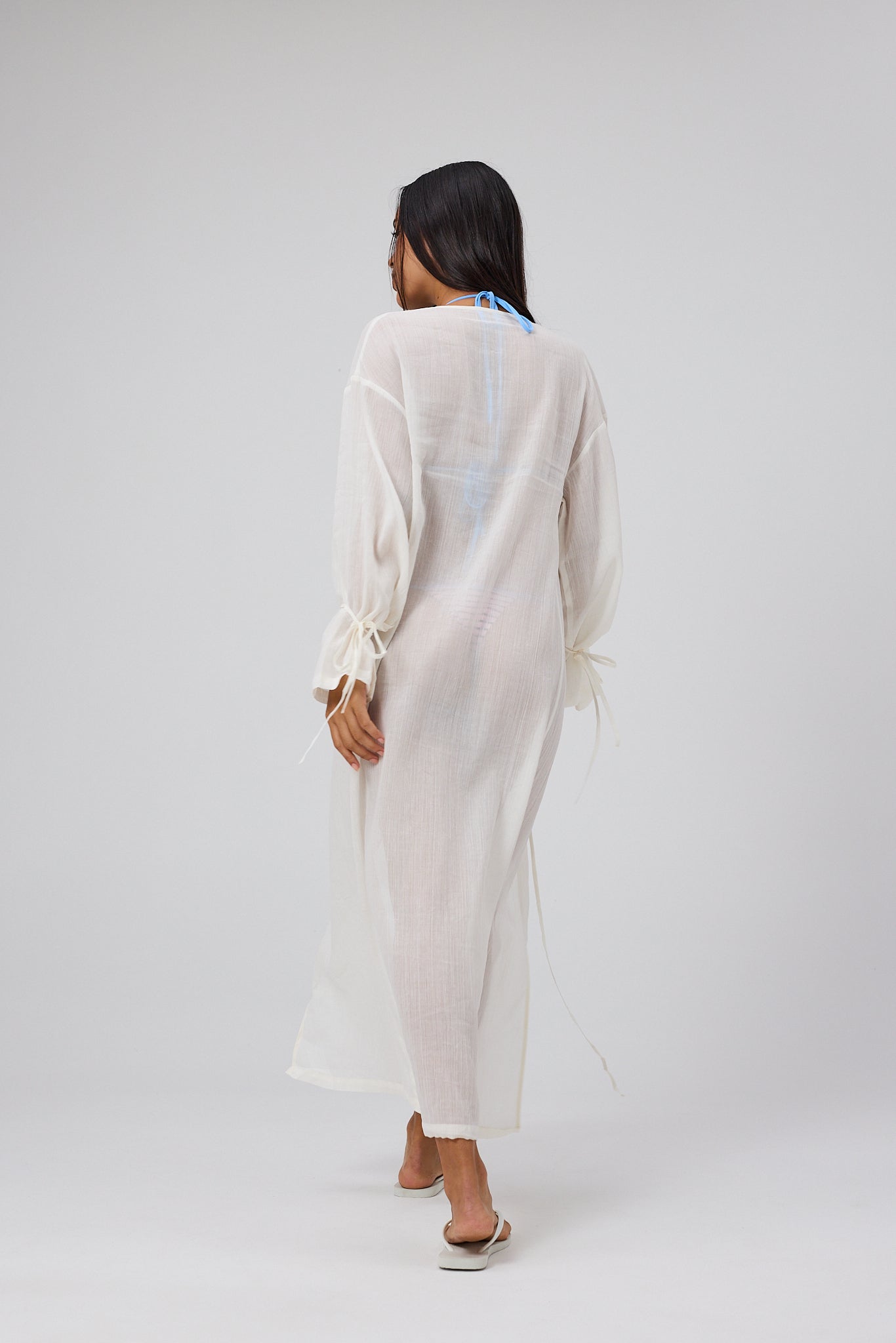 Breeze Kimono er designet med et let og flydende udtryk, hvor det sheer materiale skaber en luftig og elegant fornemmelse. Den lange maxi-længde tilfører bevægelse og giver et afslappet, men raffineret look.