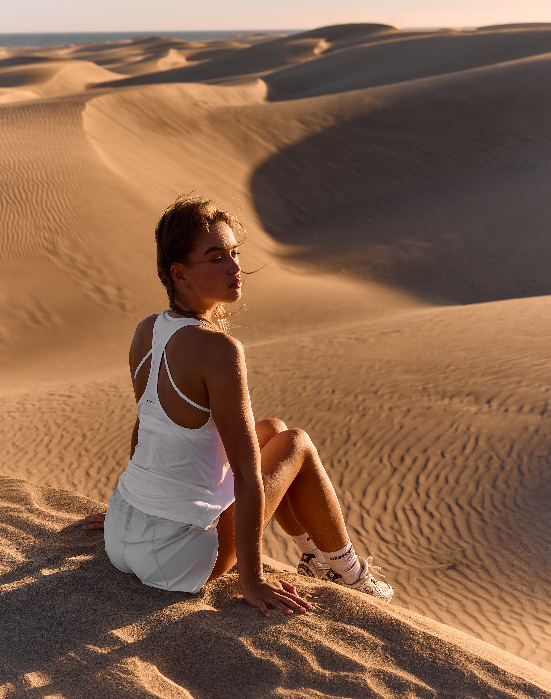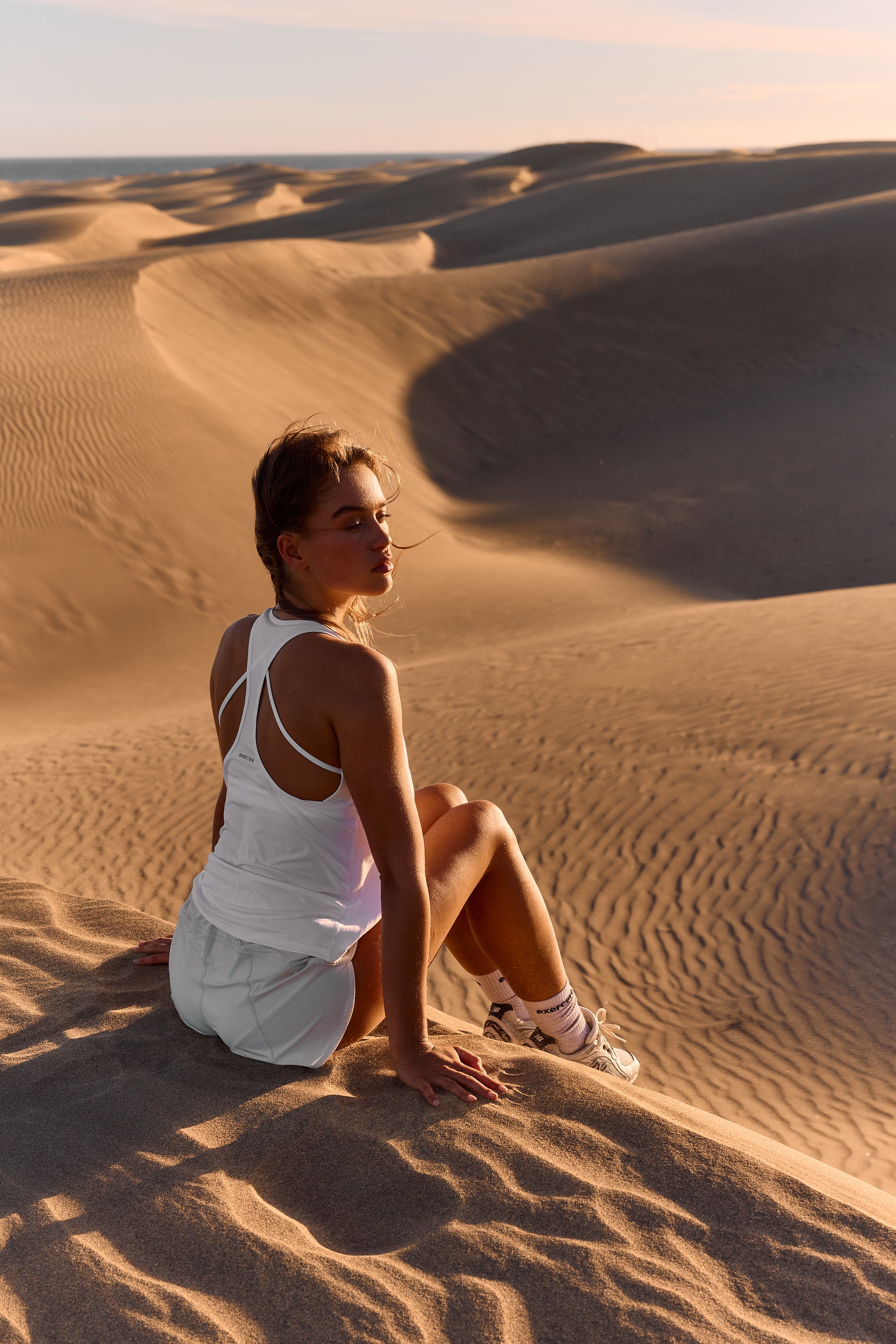 Det lette materiale falder naturligt mod kroppen og skaber en behagelig, åndbar oplevelse, mens racerback-designet sikrer bevægelsesfrihed og et klassisk, sporty look. Et subtilt Exercere-logo på ryggen fuldender det enkle og tidløse design. Flow Racer Tank Top er et alsidigt træningslag, skabt til aktivitet, hvor lethed, komfort og et rent udtryk er i fokus.