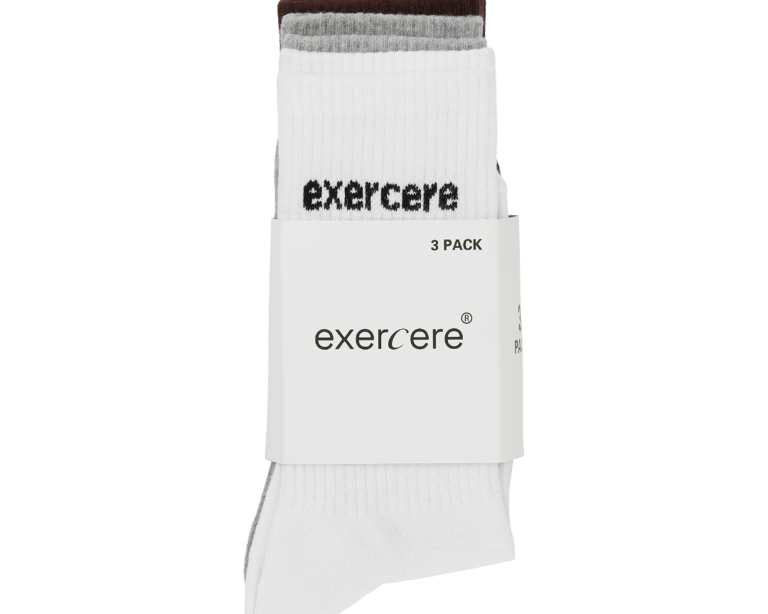Klassiske tennissokker i rib materiale med Exercere logo på siden. I denne 3-pack får du tre farver, White, Pecan Brown & Grey. Perfekte til træning eller hverdagsbrug. Fuldend dit look med et Exercere sæt.