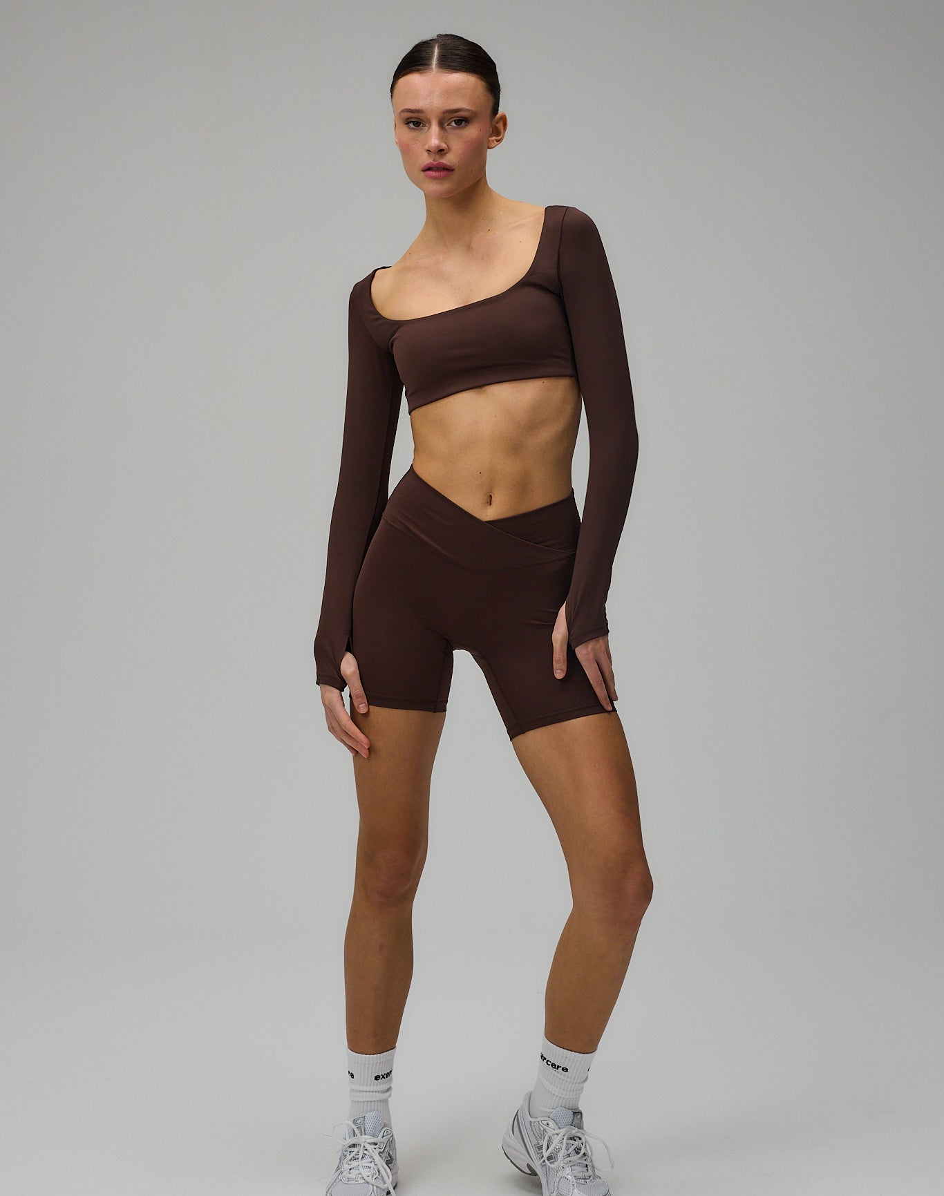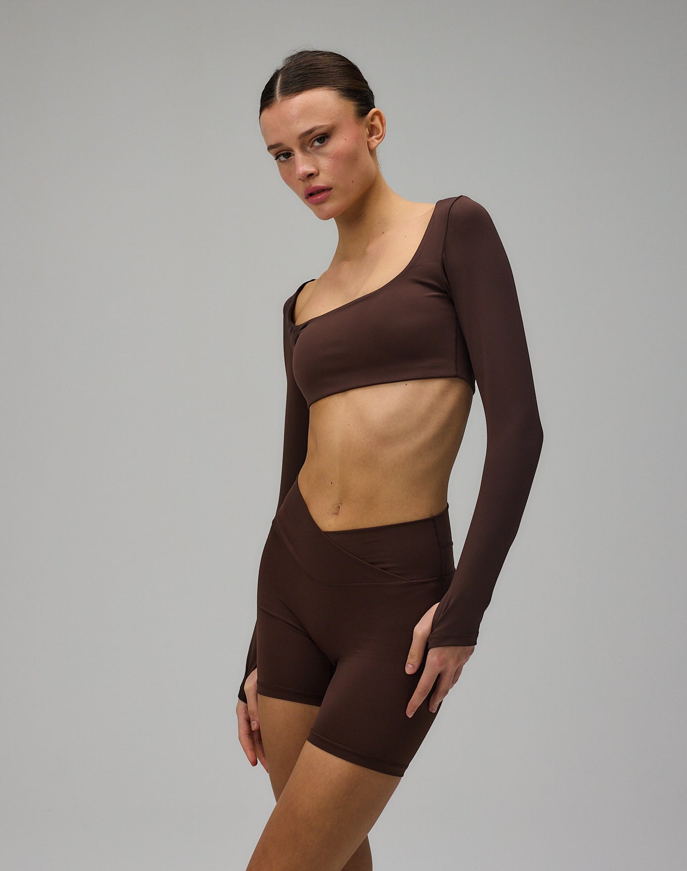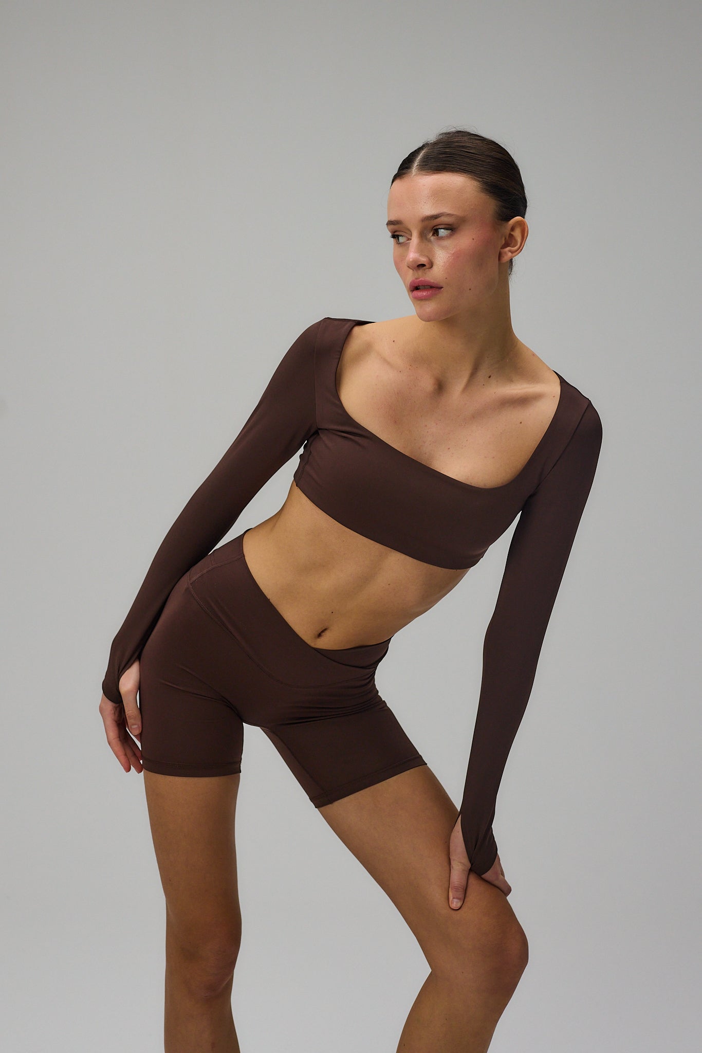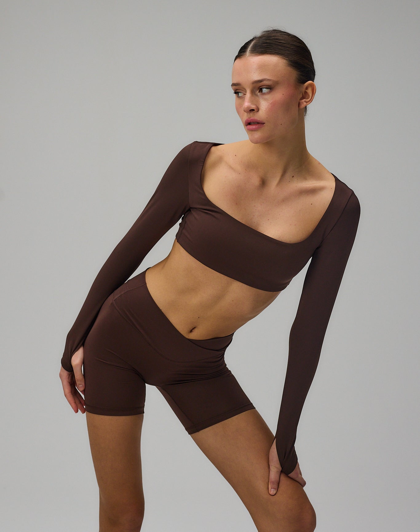 Cropped Long Sleeve er designet med fokus på pasform, komfort og et rent udtryk. Den kortere silhuet kombineret med de lange ærmer skaber en balanceret og feminin form. Den firkantede udskæring tilfører en elegant detalje, mens tommelfingeråbningerne holder ærmerne på plads under bevægelse. Den bløde og strækbare kvalitet følger kroppen naturligt og giver let støtte uden at føles begrænsende.